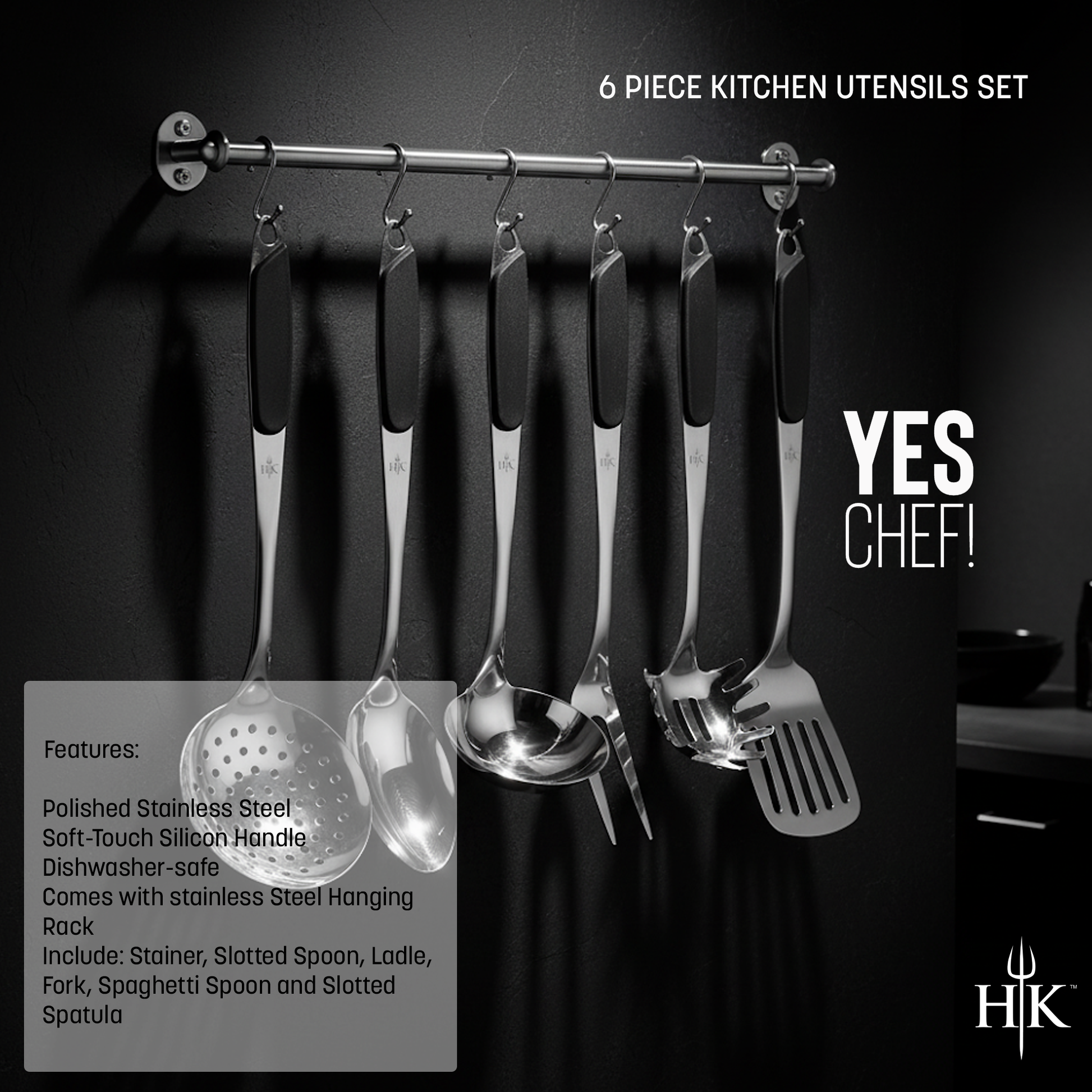 Upgrade your cooking experience with the Hell's Kitchen 6-Piece Stainless Steel Kitchen Utensil Set, designed to handle everyday cooking tasks with style and durability. This must-have collection includes a strainer, slotted spoon, ladle, fork, spaghetti spoon, and slotted spatula - all crafted from premium, corrosion-resistant stainless steel. An included hanging rack keeps your utensils organized and within reach, while ergonomic handles provide a secure, comfortable grip. Perfect for stirring, flipping, straining, and serving, these versatile tools are an ideal addition to any kitchen.