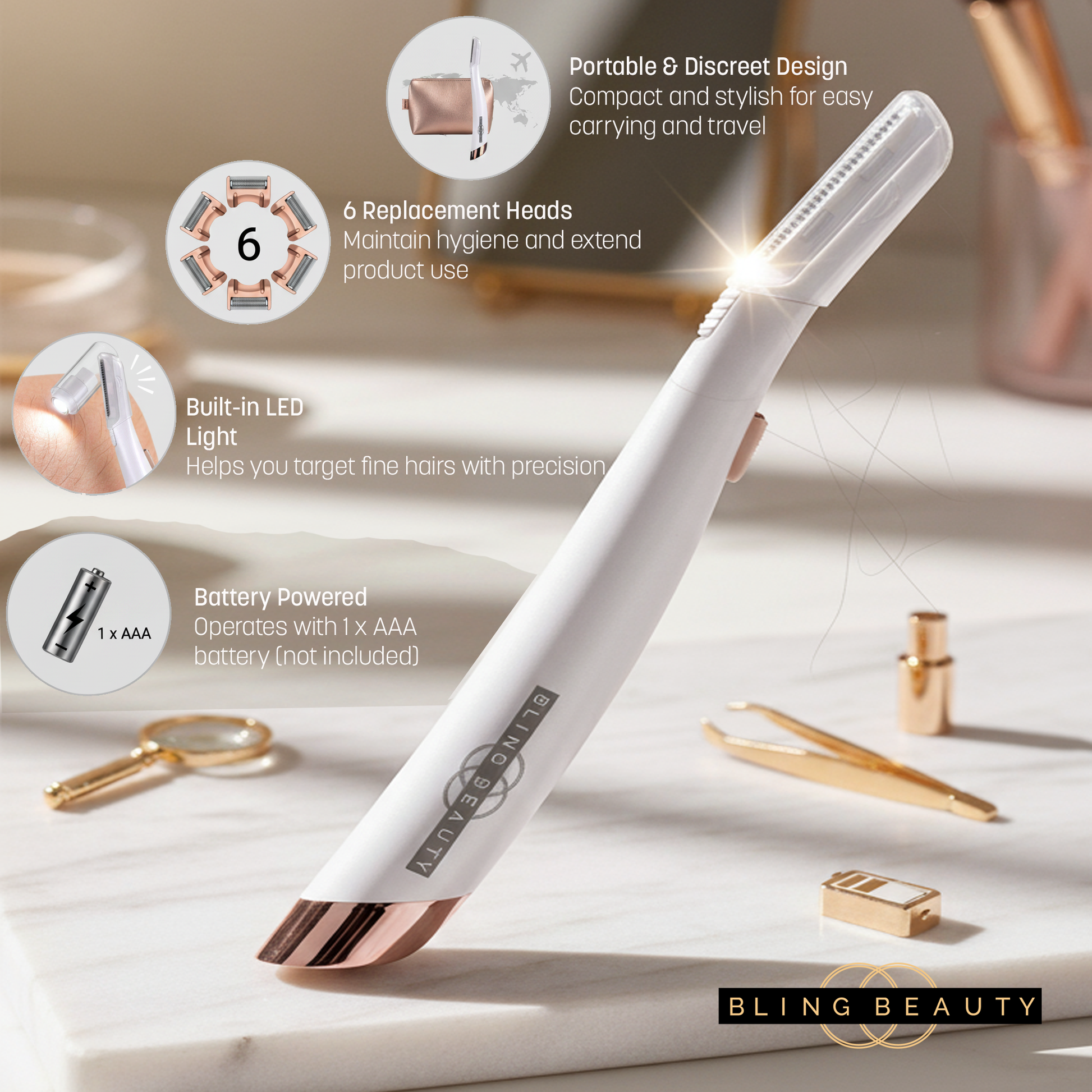 Reveal a brighter, smoother complexion with our Bling Beauty Dermaplaning Facial Exfoliator. This sleek, portable tool gently removes peach fuzz and dead skin cells, enhancing your skincare routine and makeup application. Designed with built-in LED lighting, 6 replacement heads, and a battery-powered operation, it's perfect for on-the-go touch-ups and glowing results - anytime, anywhere.
