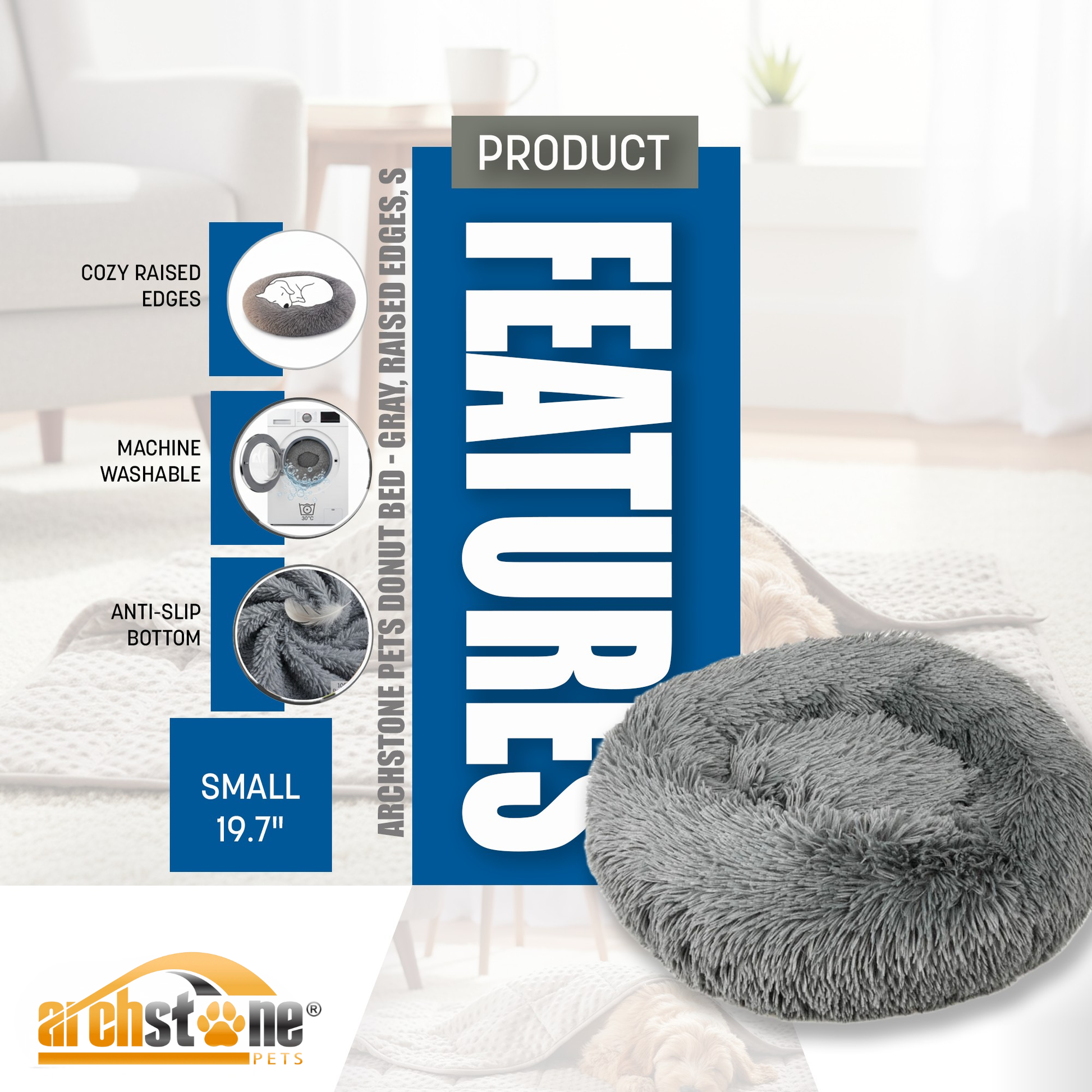 Archstone Pets Donut Bed - Gray, Raised Edges, S M L Sizes