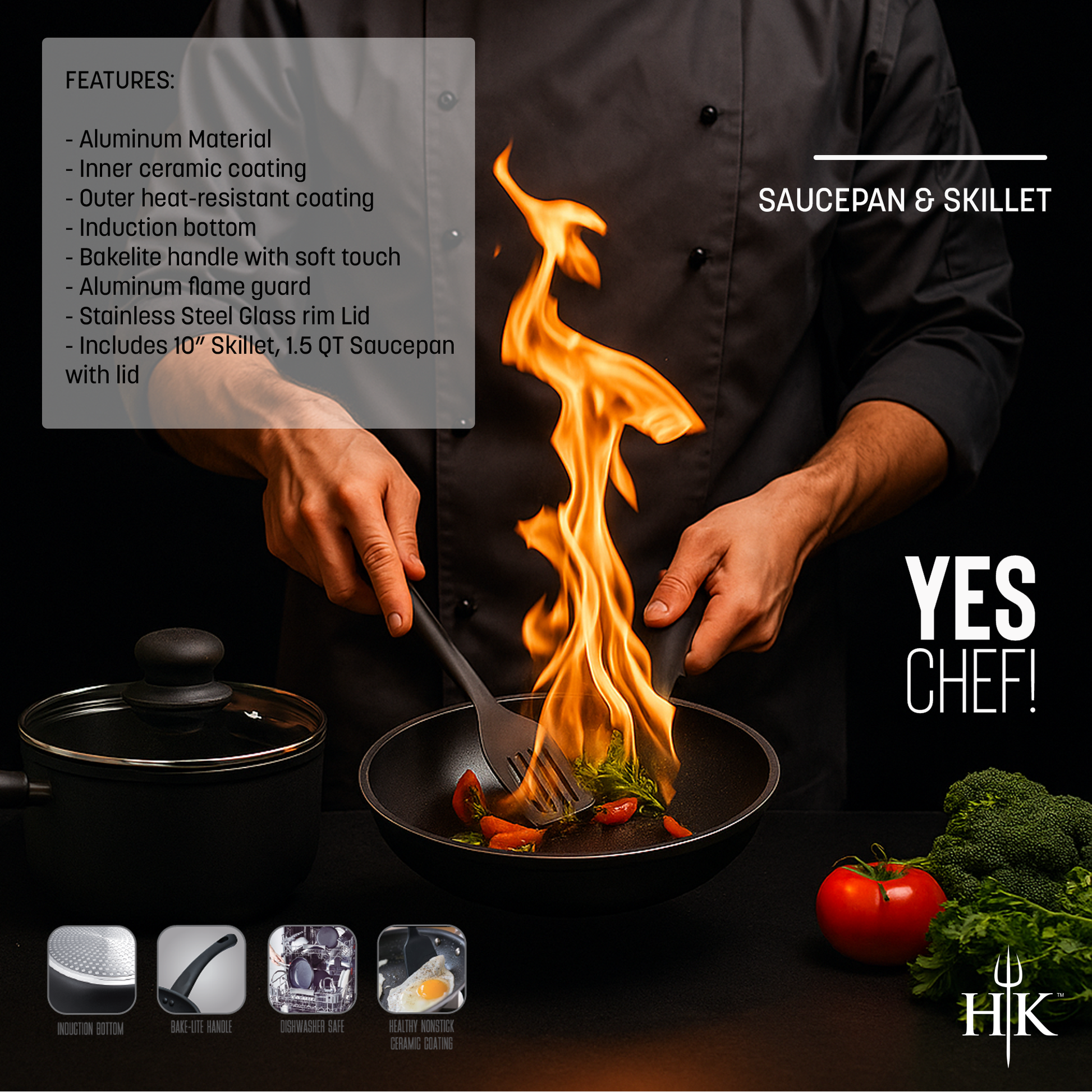 Bring professional quality to your home kitchen with the Hell’s Kitchen 1.5-Quart Saucepan and 10-Inch Skillet Set - a versatile duo crafted for everyday cooking. Made from durable aluminum with an induction bottom, this set ensures fast, even heat distribution across all stovetops. The inner ceramic coating provides a smooth, nonstick cooking surface for healthier meals and effortless cleanup, while the outer heat-resistant coating adds durability and style. Designed with a Soft Touch Bakelite handle, each piece offers a comfortable grip and safe handling, whether you’re simmering sauces, boiling pasta, or pan-frying your favorites.