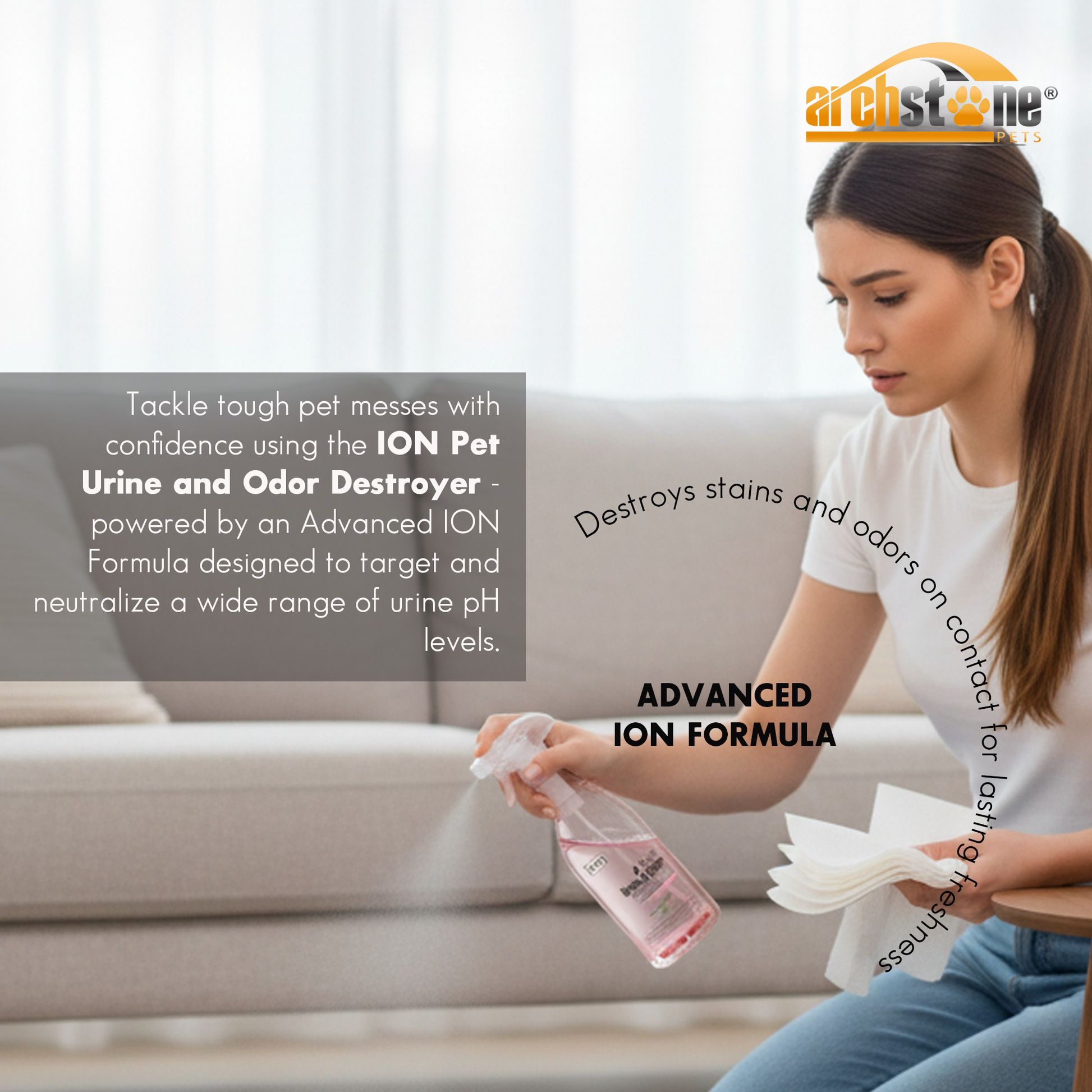 Say goodbye to tough pet messes with our ION Cat Urine and Odor Destroyer - powered by a specially balanced ION Formula that targets even the strongest stains and odors. Designed with feline-friendly care, this advanced cleaner tackles urine, litter box messes, sticky stains, vomit, hairballs, feces, and territorial markings, all while neutralizing foul odors on contact. The refreshing Acai-Pomegranate scent leaves your home smelling clean without any overpowering fragrance.