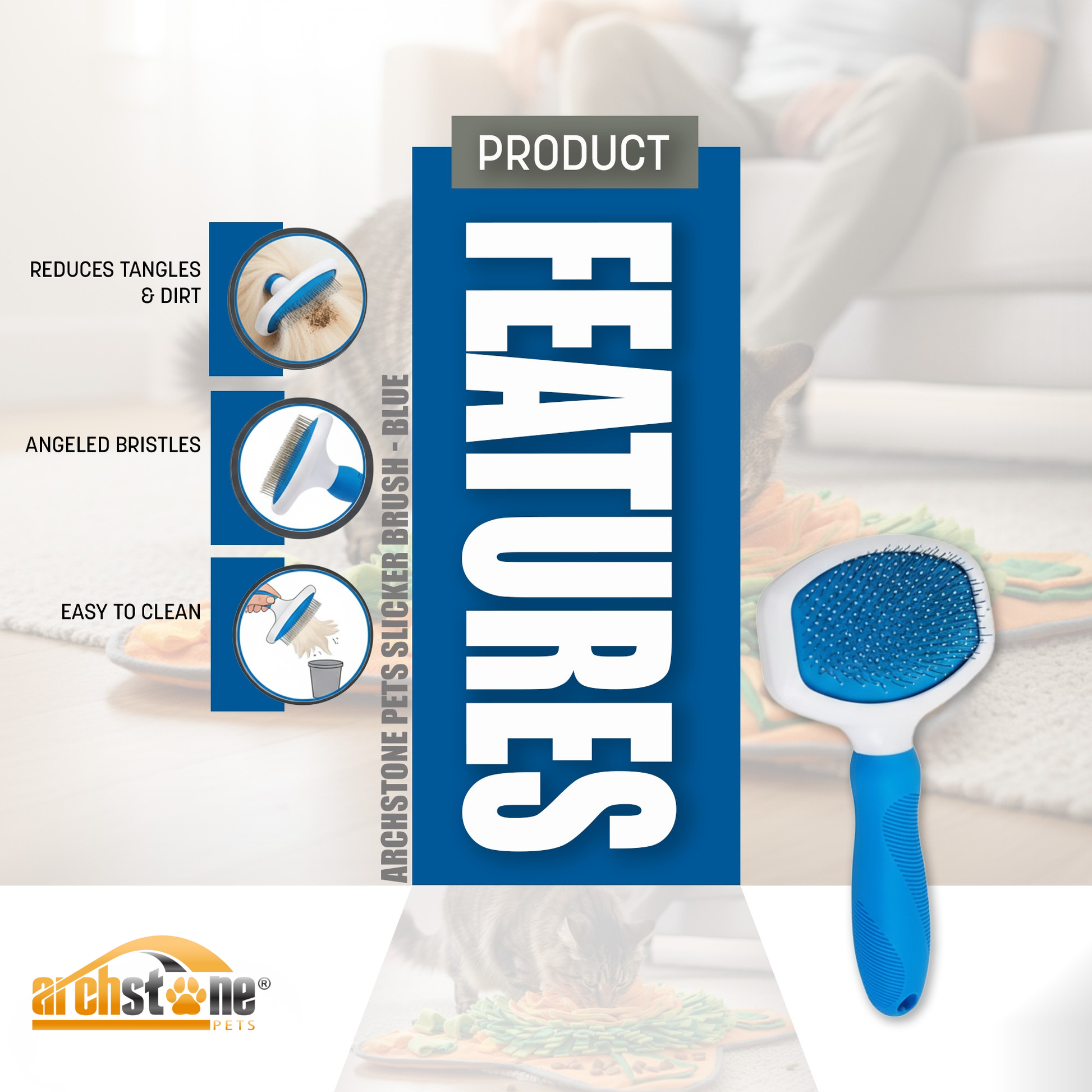 Groom your furry friend with ease and comfort using our Archstone Pets Slicker Brush. Designed for everyday use, this high-quality brush helps reduce tangles, remove dirt, and keep your pet’s coat shiny and healthy. Equipped with plastic-coated pins to protect your pet's skin and a comfort-grip handle for you, this brush ensures a smooth and controlled grooming session every time. Perfect for all-sized pets, it’s a must-have for any pet owner!