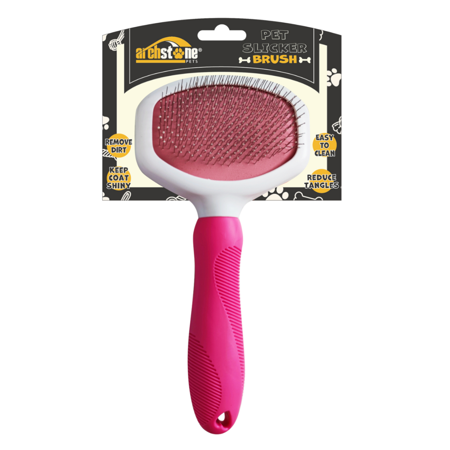 Groom your furry friend with ease and comfort using our Archstone Pets Slicker Brush. Designed for everyday use, this high-quality brush helps reduce tangles, remove dirt, and keep your pet’s coat shiny and healthy. Equipped with plastic-coated pins to protect your pet's skin and a comfort-grip handle for you, this brush ensures a smooth and controlled grooming session every time. Perfect for all-sized pets, it’s a must-have for any pet owner!