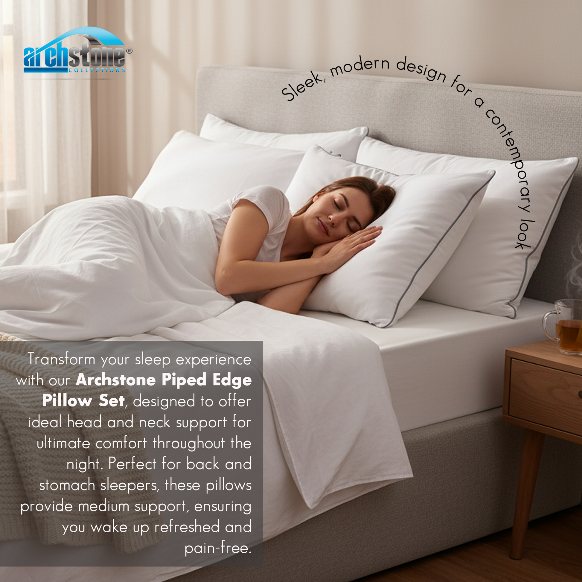 Transform your sleep experience with our Archstone Piped Edge Pillow Set, designed to offer ideal head and neck support for ultimate comfort throughout the night. Perfect for back and stomach sleepers, these pillows provide medium support, ensuring you wake up refreshed and pain-free. The piped edges add a touch of sophistication to the classic white design, making them a stylish addition to any bedroom. Machine washable and ready to offer restful nights, this two-piece set is a must-have for your sleep routine.