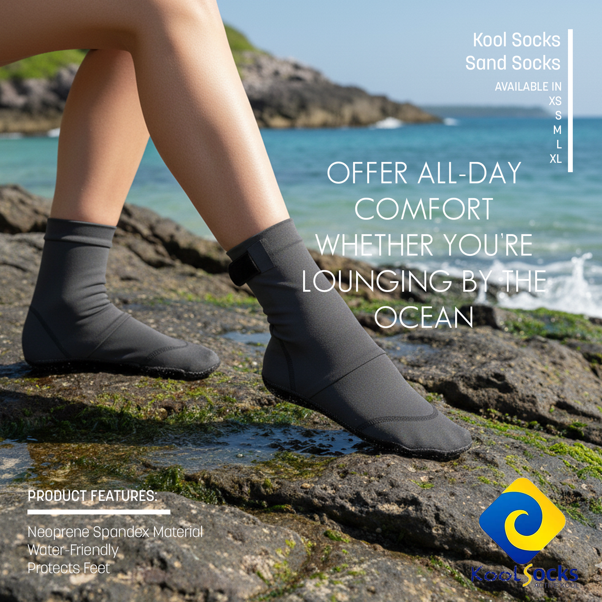 Keep your feet cool and protected on any beach day with Kool Socks - the ultimate water-friendly beach socks made from breathable neoprene spandex material. Designed to shield your feet from hot or cold sand, they offer all-day comfort whether you’re lounging by the ocean, playing at the lake, or walking along the shore. Lightweight and quick-drying, Kool Socks come in multiple colors and sizes, making them a must-have for your next beach adventure.